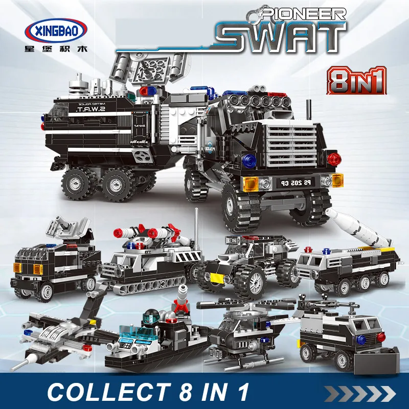 | XINGBAO NEW 13003 Swat Series 8 IN 1 Pioneer Swat Truck Sets Building Blocks Armored Vehicles Bricks Compatible Legoings Swat |