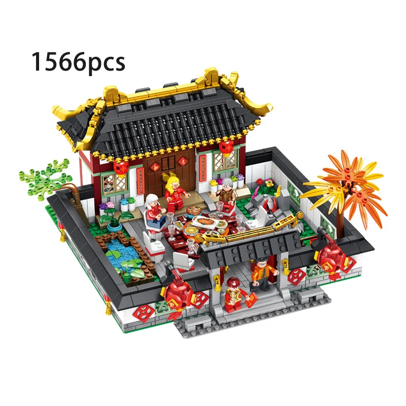 | Classic Chinese New Years Eve Dinner Building Blocks Hui Style Architecture Bistro Water Village Bricks Model Toys for Kids |